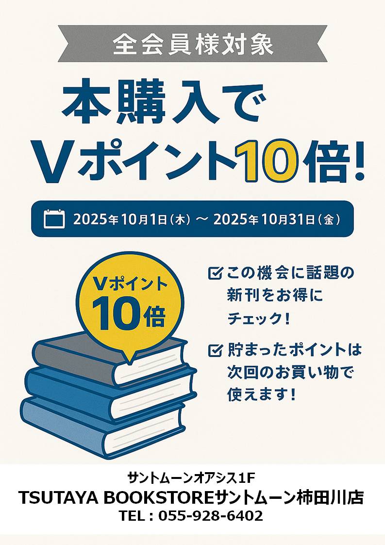 本購入でVポイント10倍キャンペーン! TSUTAYA BOOKSTORE 2025.10.01掲載 全会員様対象 キャンペーン期間中、本(書籍・コミック・雑誌)を購入いただくと Vポイントが10倍に! アプリ・会員証をご提示いただければポイント付与致します。 当日、会員登録をしていただいてもOK! この機会に、気になっていた本をお得に購入してみてください。 TSUTAYA BOOKSTORE 書籍・文具 オアシス1F ショップニュース一覧