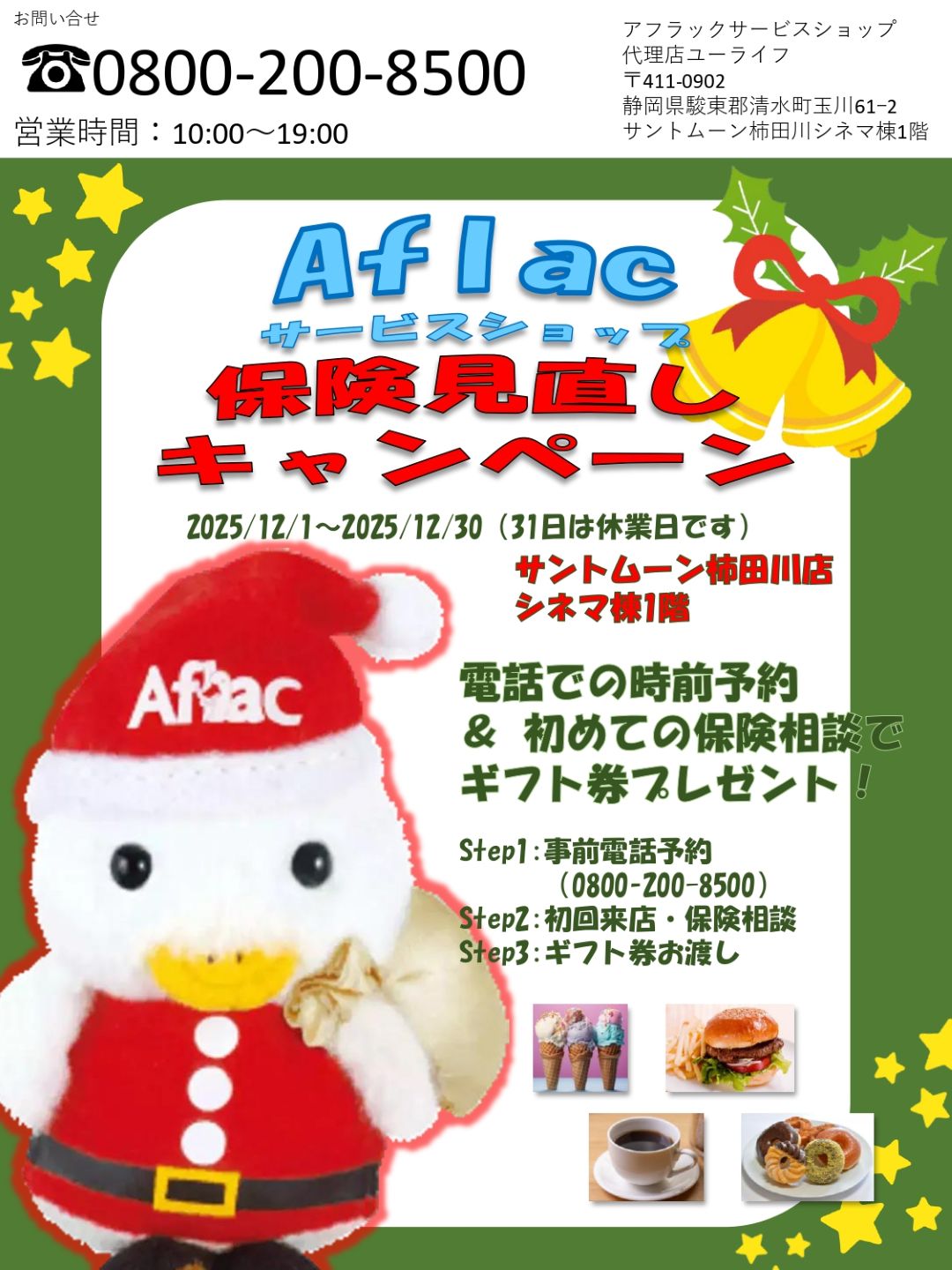 保険見直しキャンペーン<12/1(月)~12/30(火)> アフラック サービスショップ 2025.11.24掲載 電話での事前予約&初めての保険相談で選べるギフト券プレゼント! アフラック サービスショップ 保険相談 シネマ棟1F ショップニュース一覧