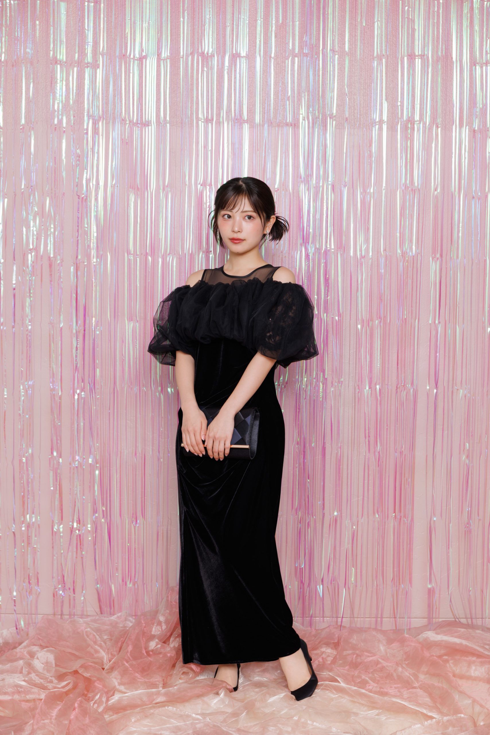 華やかなレースを使い、ほんのり透けて見える価値観のある仕様に。 ドレスはストレッチの効いたベロア素材を使い、