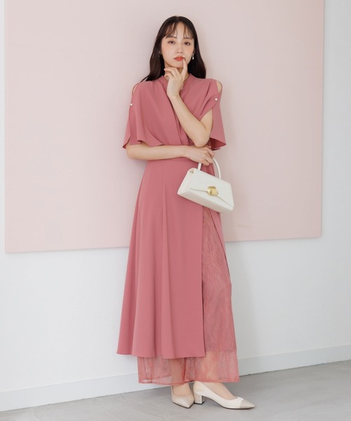 【デザイン】 肩のスリットからさりげない肌見せがドレッシーなデザイン。 肩のパール使いがさりげないポイントとなりオシャレな印象に。 ワンピーススリットからさりげなく見えるレースパンツを