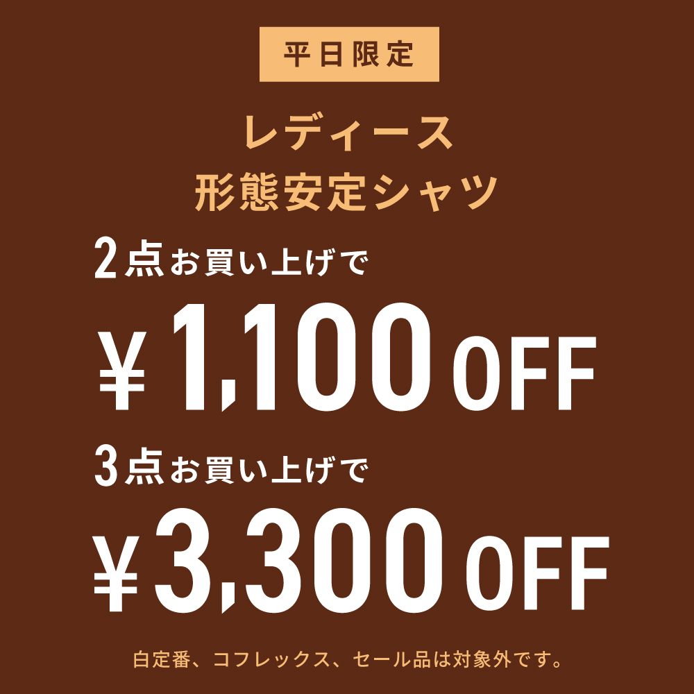 まとめ買いするほどお得になります! ※セール品など一部除外品がございます ■レディース:税込4,389円以上の形態安定シャツが 2点お買い上げで1,100円OFF、