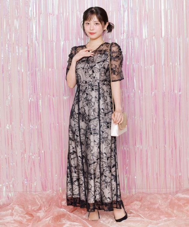【デザイン】 スパンコールを織り交ぜた花柄の刺繍素材を贅沢に使ったワンピースドレス。 ウエスト切替やVネックなど、スタイルアップ見え要素ばっちりのドレスに