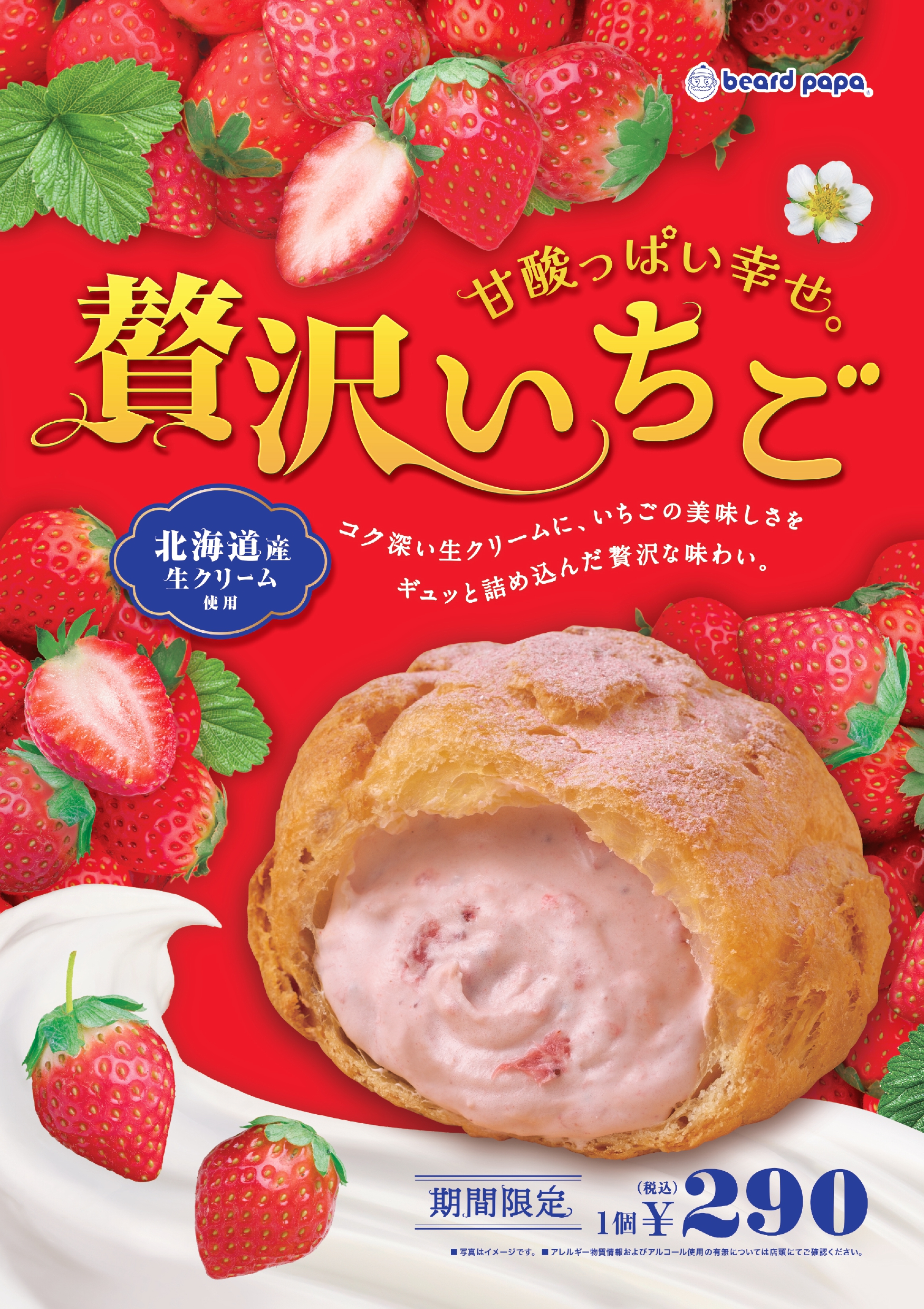 季節限定販売『贅沢いちご』 ビアードパパ 2026.01.01掲載 コク深い生クリームに、いちごの美味しさをギュッと詰め込んだ贅沢な味わい。 ビアードパパ シュークリーム・洋菓子 本館1F ショップニュース一覧