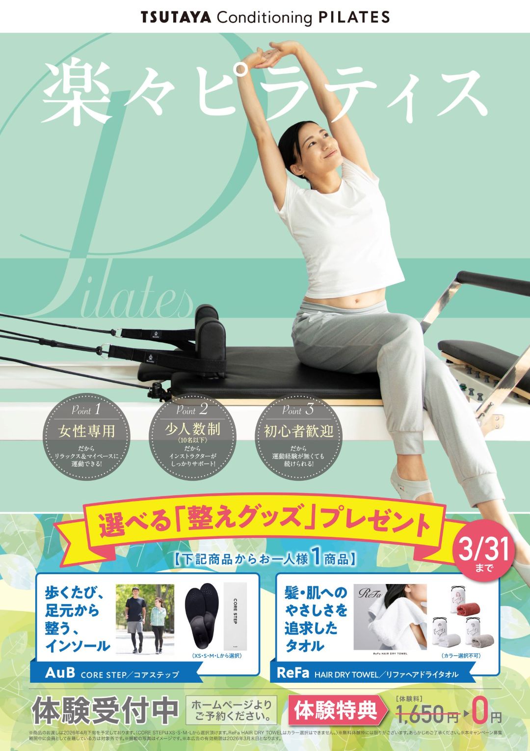 ピラティス 3月ご入会キャンペーン TSUTAYA BOOKSTORE 2026.03.02掲載 新規ご入会で、「整える」グッズをプレゼント! ①歩くたび、足元から整うインソール ②髪・肌へのやさしさを追求したタオル お好きなものをお選びいただけます。 期間:3月1日(日)から3月31日(火) 無料体験も実施中です。 マシンピラティスが気になっている方は是非ご体験ください。 TSUTAYA BOOKSTORE 書籍・文具 オアシス1F ショップニュース一覧