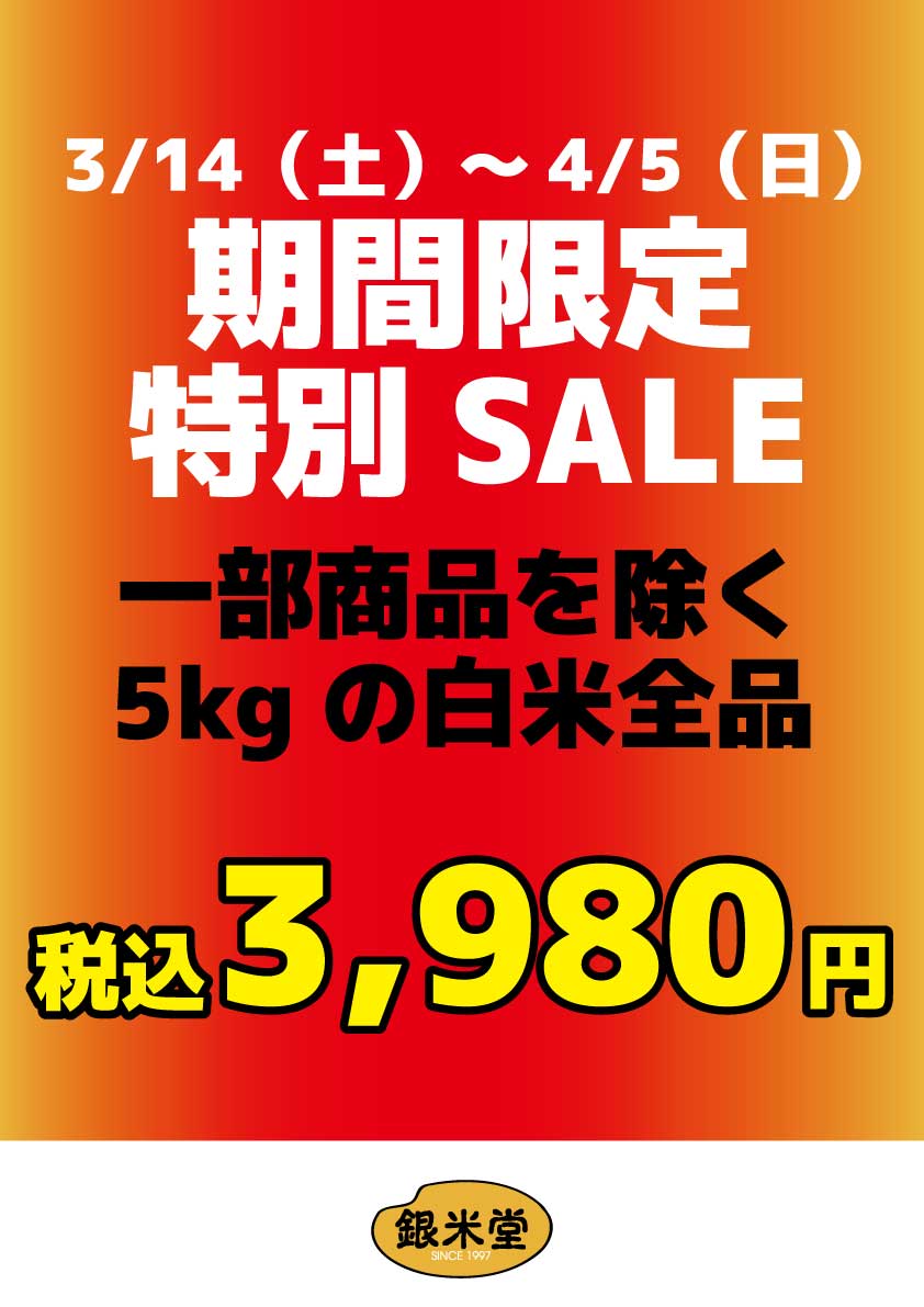 5kgの白米を、全て税込3,980円で販売いたします!!!