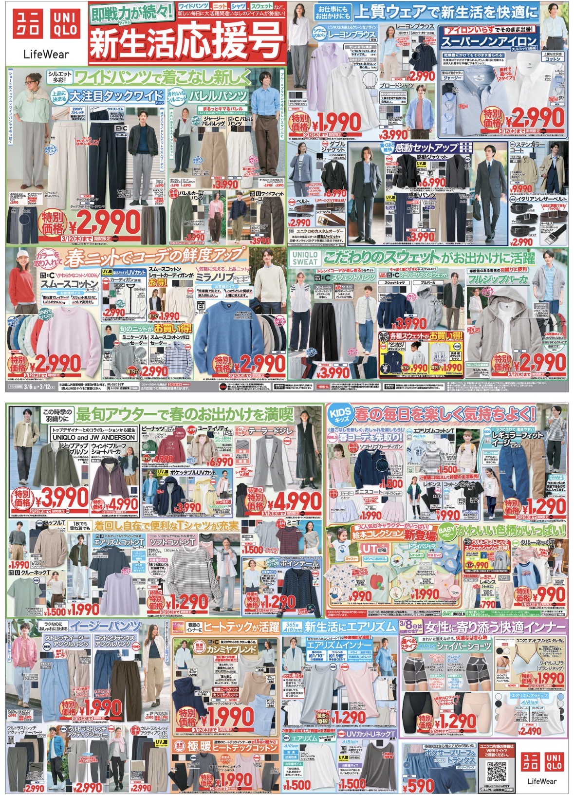 上質ウェアで新生活を快適に❗️新生活応援号‼️ ユニクロ 2026.03.06掲載 上質ウェアで新生活を快適に❗️新生活応援号‼️ お得も新作も店内満載❗️ ワイドパンツ、ニット、シャツ、スウェットなど新しい毎日に大活躍間違いなしのアイテムが勢揃い❗️ gallery ユニクロ ファミリーファッション アネックス1F ショップニュース一覧