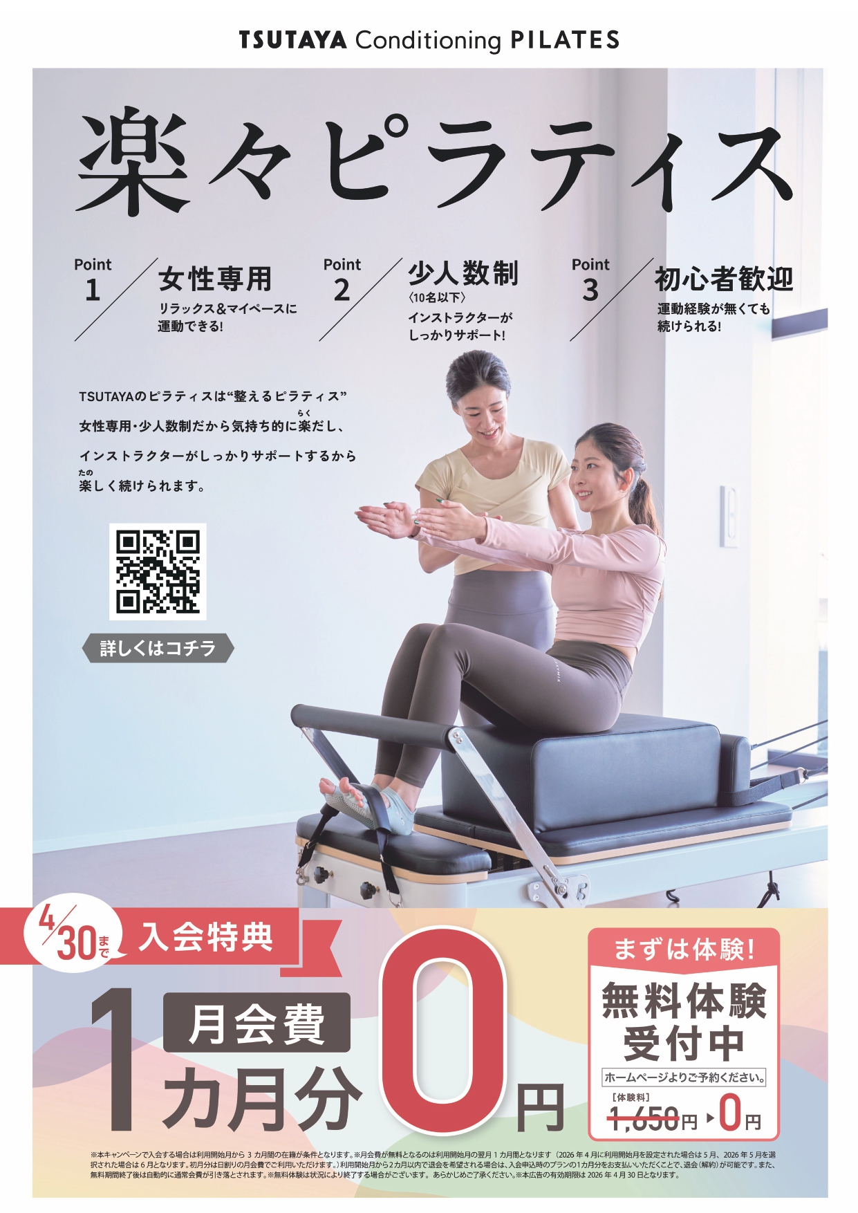 入会キャンペーン! TSUTAYA BOOKSTORE 2026.04.01掲載 4/30(木)までのご入会で、 月会費13,200円(税込)が1ヶ月分無料の キャンペーンを実施いたします! まずは無料体験にお越しいただいて、 マシンピラティスを体感してみてください。 TSUTAYA BOOKSTORE 書籍・文具 オアシス1F ショップニュース一覧