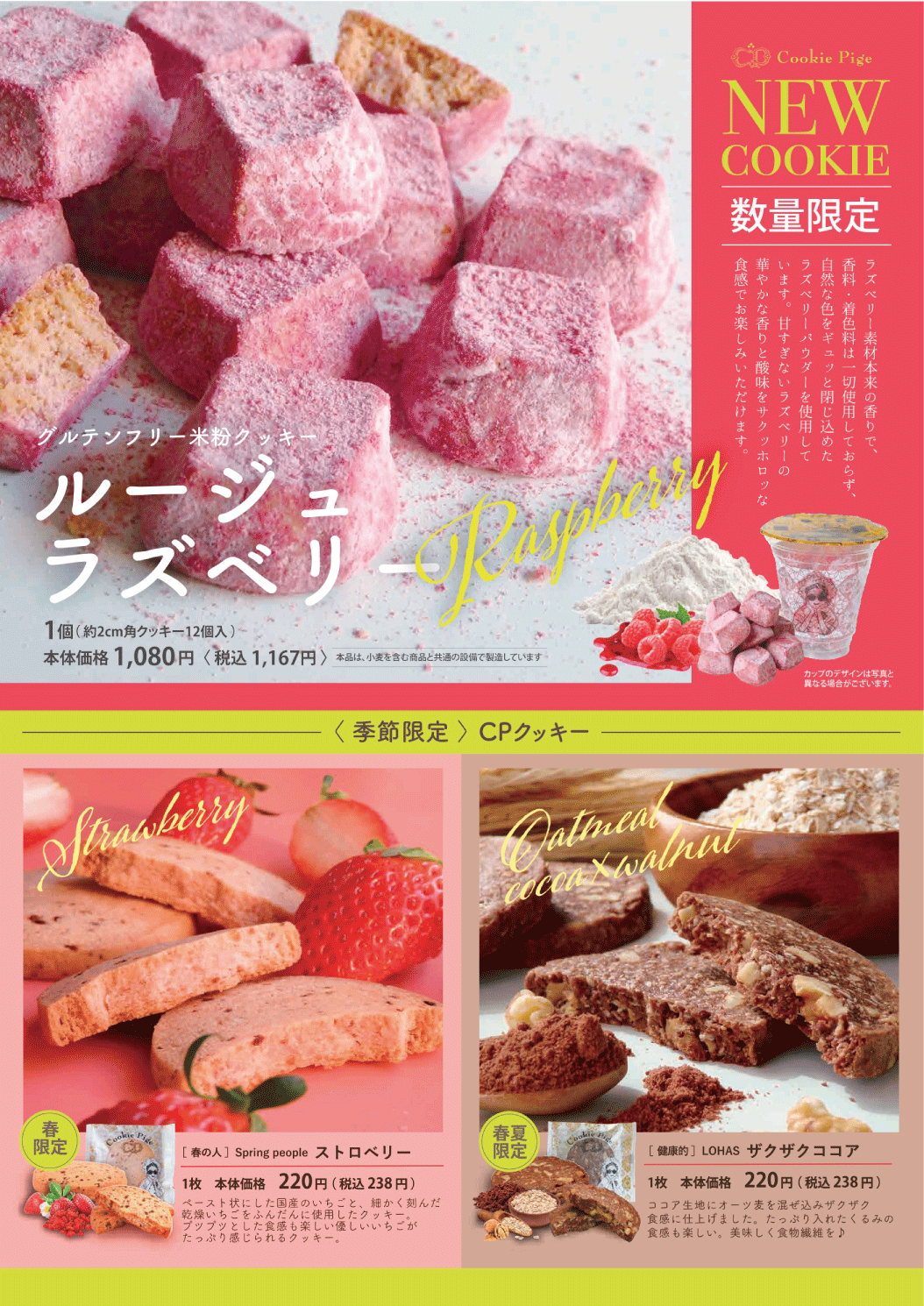 グルテンフリー米粉クッキー Cheese Pige 2026.04.06掲載 CookiePige グルテンフリー米粉クッキーの新フレーバー ルージュラズベリーが4月1日より数量限定で販売開始しました! この機会に是非ご賞味ください🎶 Cheese Pige クッキーチーズサンド・焼き菓子 オアシス1F ショップニュース一覧