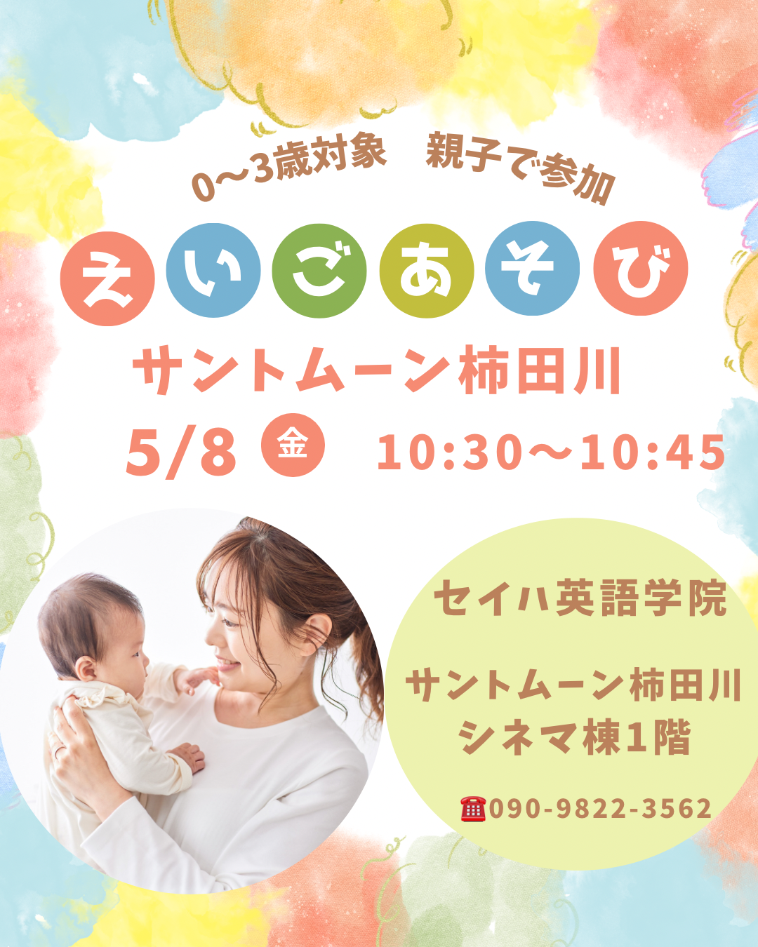 5月のえいごあそび セイハ英語学院 2026.04.23掲載 0歳~3歳対象の15分間のミニレッスン♪ 無料で参加できます!お気軽にご参加ください☆ セイハ英語学院 英会話教室 シネマ棟1F ショップニュース一覧
